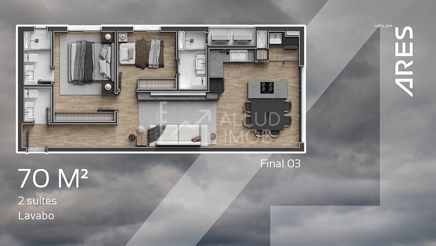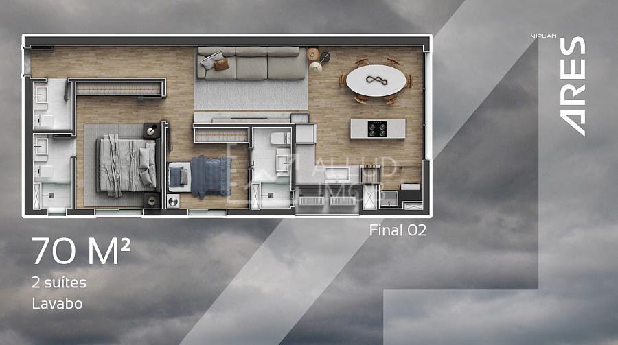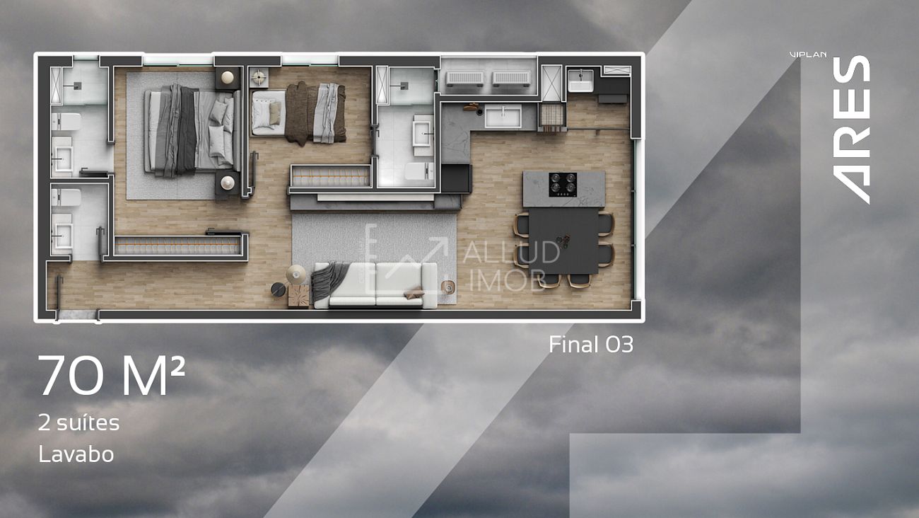 Com 42 apartamentos distribuídos em torre única de 16 andares, o Ares oferece plantas de 70m² e 90m², pensadas para proporcionar praticidade, conforto e excelente aproveitamento dos espaços no dia a dia.