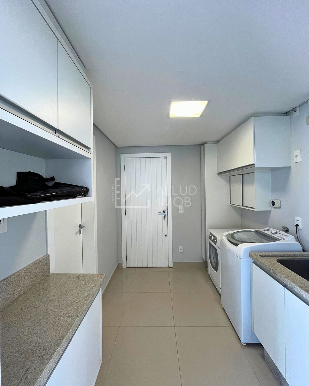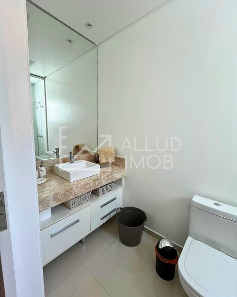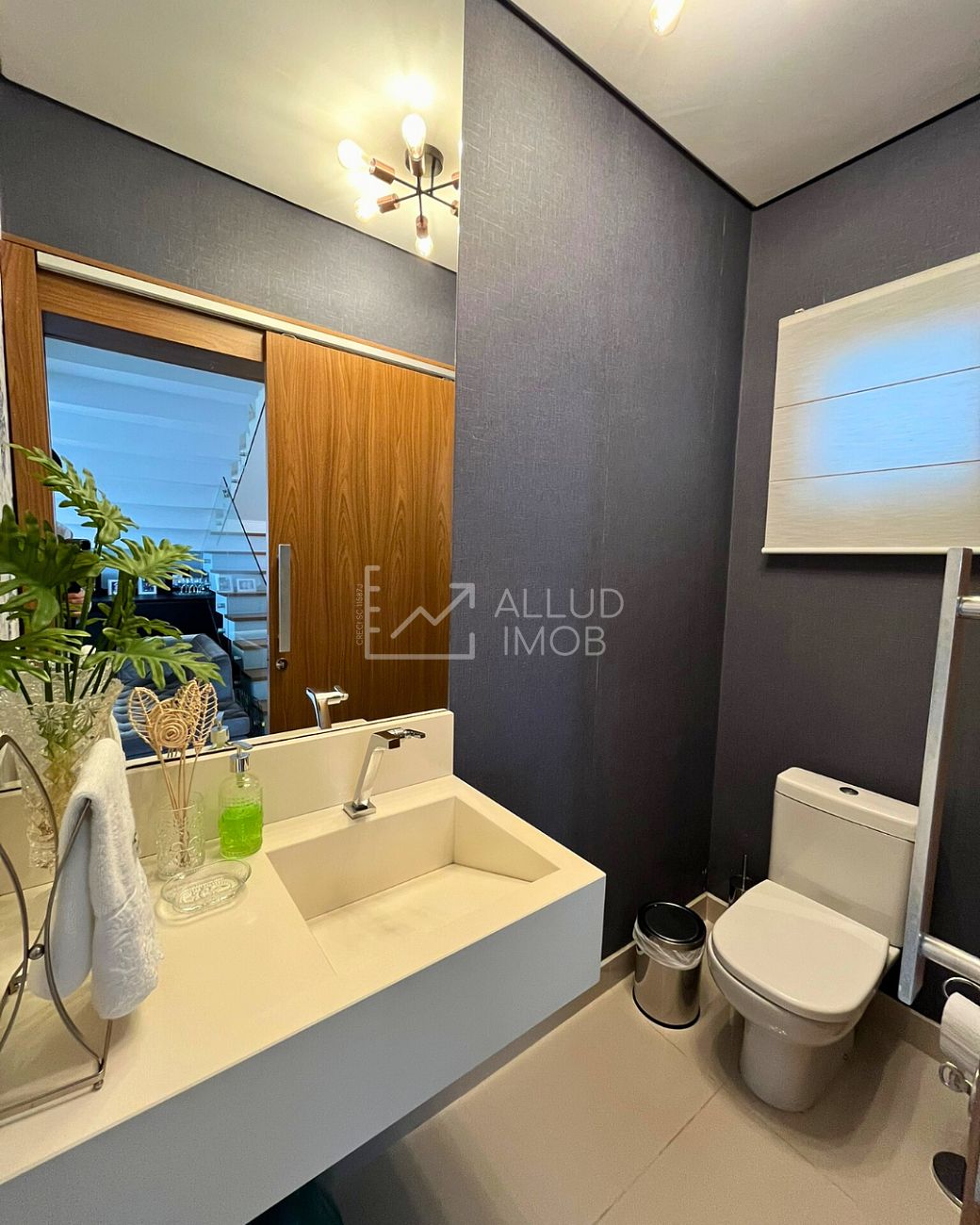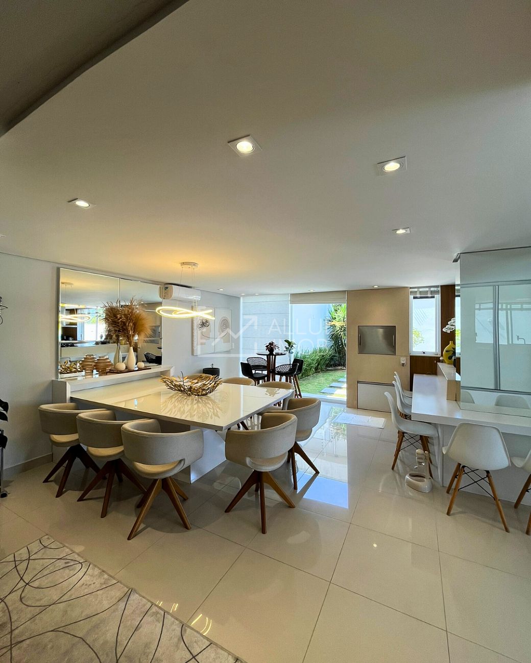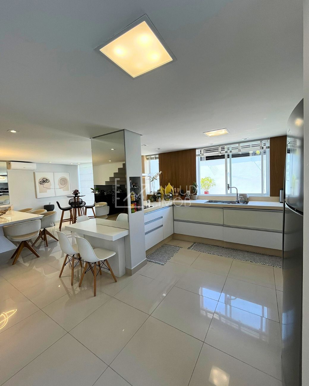 Lavabo, cozinha, sala de jantar e área gourmet com churrasqueira integrada.